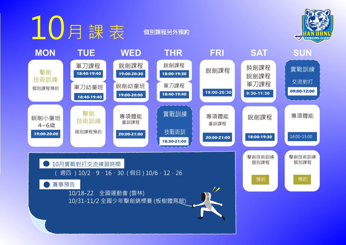 授課日期:配合學子班別課程共同學習上課能培養與孩子的互動與話題,更能了解孩子在學習上所遇到的問題及收穫,使親子間達到共同面對問題,共同解決問題,共同享受擊劍所帶來的成就與樂趣